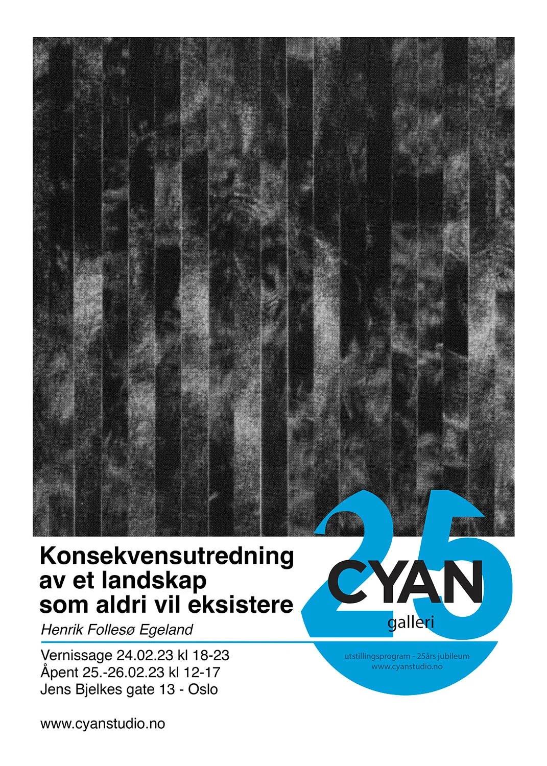 CYAN studio feirer sitt 25-års jubileum med å gjøre som vi alltid har gjort, å åpne våre lokaler for å gi rom og muligheter til nye stemmer og spre engasjement og samhold i fotomiljøet. Årets utstillere ved CYAN galleri blir invitert til å ikke bare stille ut egne fotoprosjekter, men å så også følge opp med å kuratere en ny utstilling med andre fotografer sine arbeider. Slik kan fotokunstnerne vi viser frem få erfaring fra begge sider av fotokunstbransjen og vi og publikum kan fortsette med å oppleve nye og overraskende stemmer og uttrykk innen mediet.